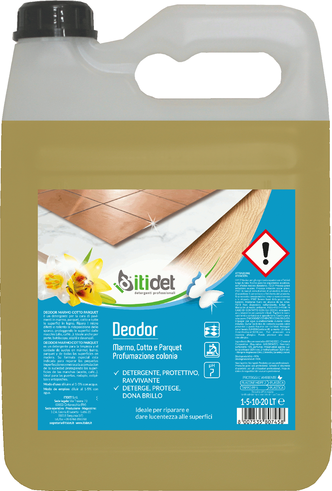 ITIDET DEODOR MARMI E PARQUET è un detergente ravvivante per uso professionale e non, indicato per pavimenti in marmo, cotto e in parquet. Protegge e conserva la lucentezza del pavimento. Lascia la superficie trattata di aspetto setoso, la protegge dalle macchie, ripara i microdifetti presenti, rallenta la rideposizione dello sporco. Rilascia una persistente fraganza di colonia e limone.