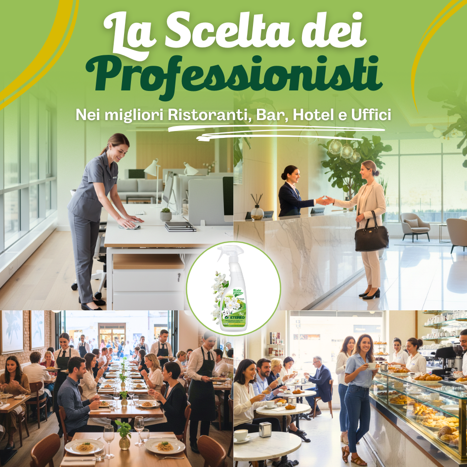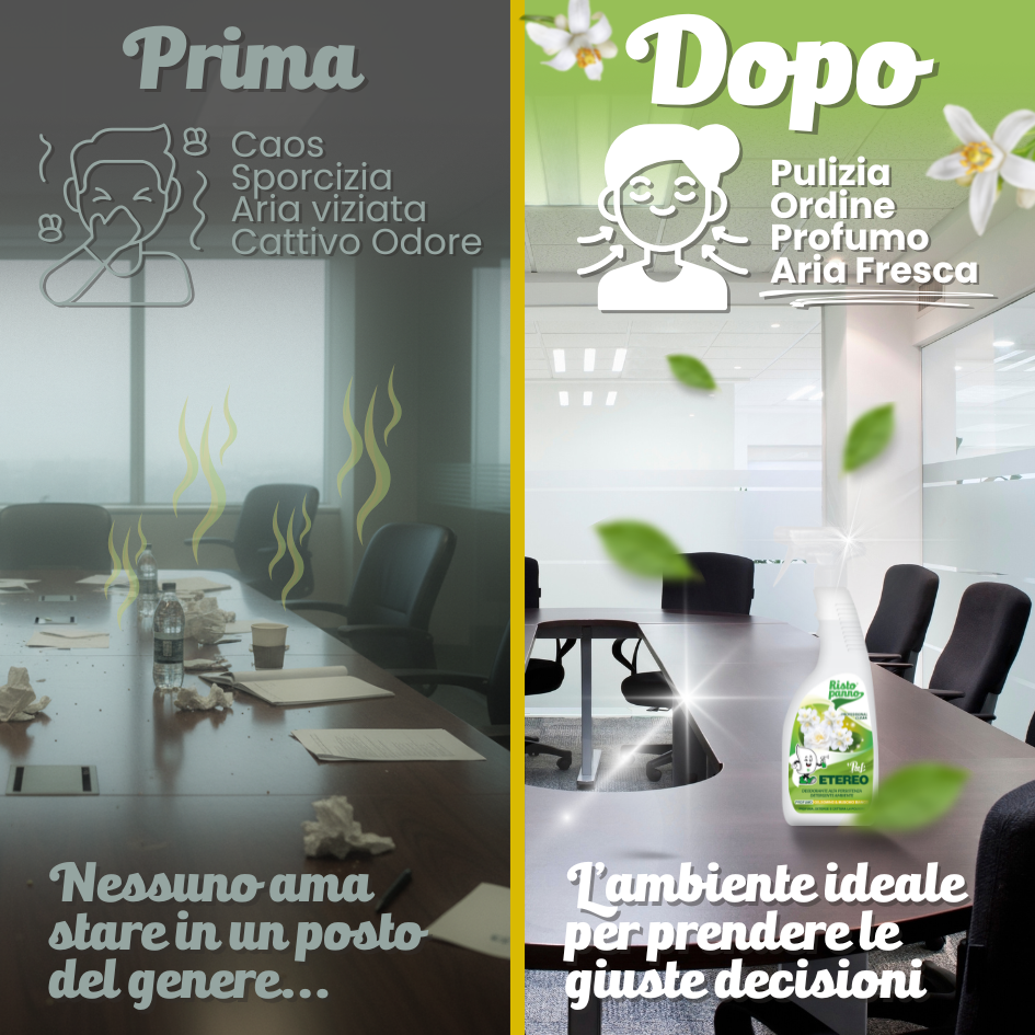 Mentre la versione Flora è vivace, Poof Etereo è sinonimo di eleganza. La sua sofisticata profumazione al Gelsomino e Muschio Bianco è studiata per ambienti professionali dove si vuole trasmettere calma, pulizia e ordine, come studi medici, reception di hotel e uffici direzionali.