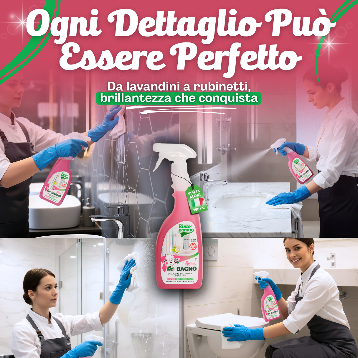 Ideale per sanitari, maioliche e docce. Idoneo per i piani di pulizia HACCP nei bagni di ristoranti e hotel.