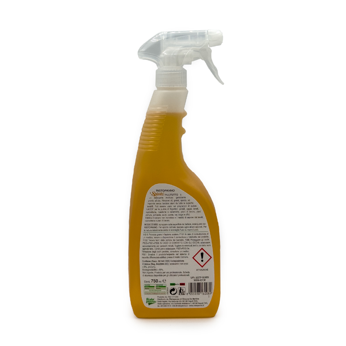 Ristopanno Splash Pulitutto è il detergente a base alcolica (pH 4) che pulisce e igienizza tutte le superfici lavabili. Formula antistatica che rallenta il rideposito della polvere.